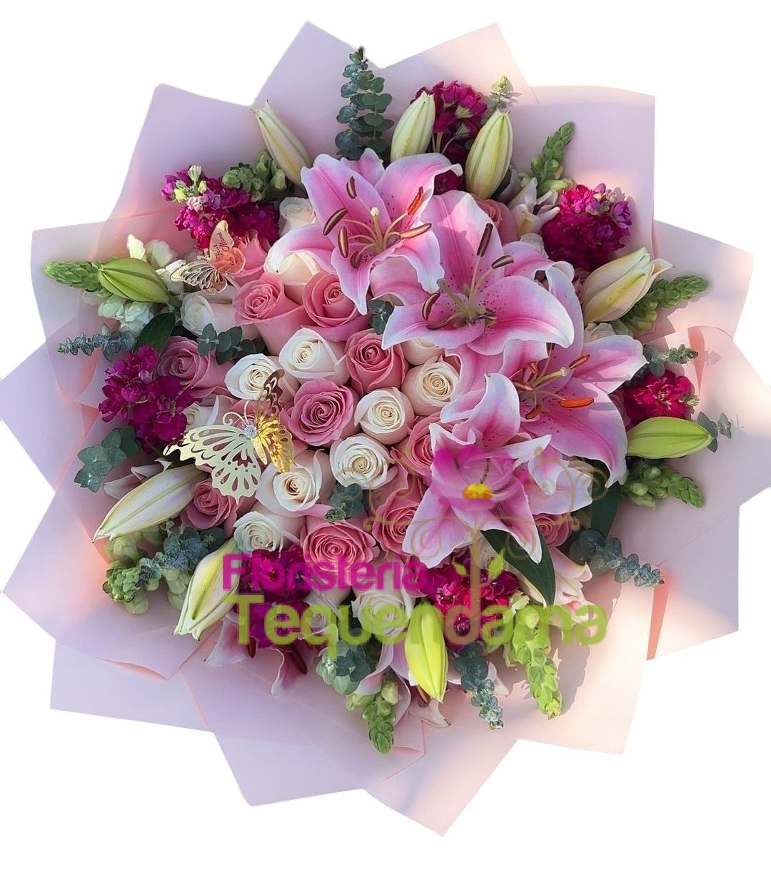 Bouquete elaborado en rosas rosadas, blancas, fucsias, con lirios, alelies, ecucalipto baby, alelies y follaje, acompañado de mariposas, papel coreano moño y tarjeta.