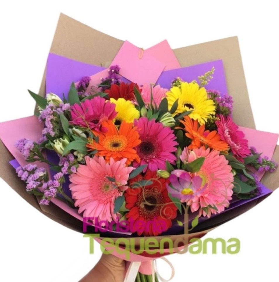 Bouquet elaborado con gerberas surtidas, astromelias extasis y follajes verdes con papel coreano moño y tarjeta