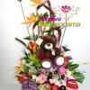 Diseño elaborado en base de madera con rosas blancas o el color de su elección lirios, orquídeas hawaianas, gipsofilia, cuero y follajes acompañado de peluche.
