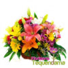 Diseño elaborado en canasta tejida con lirios, rosas, tonos pastel chamizos y follajes