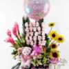 Diseño elaborado en canasta de mimbre con aves del paraíso, calas, maracas, ginger, anturios, gerberas, orquídeas variadas, lirios, canciones de la india, sombrillas chinas y follajes. Acompañado peluche y variedad de frutas.
