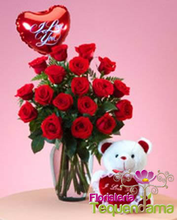 Diseño elaborado en base de vidrio, con rosas rojas y follajes, acompañado de globo y peluche.