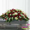 Cubre cajón, elaborado en rosas, azucenas, hojas y follajes.