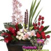 Diseño elaborado en base de vidrio, con vara de orquídeas Cymbidium, hojas y piedras rústicas.