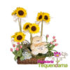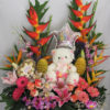 Diseño elaborado en base de madera con lirios, rosas, anturios, hortensias y follajes. Acompañado de peluche y globo