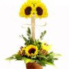 Diseño elaborado en canasta tejida, con girasoles, campanas de Irlanda y follajes.