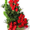 Diseño elaborado en base de madera o vidrio con rosas rojas,o el color de su elección hojas verdes y follajes.